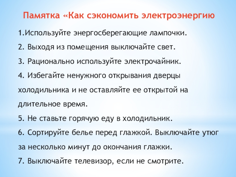 Памятка «Как сэкономить электроэнергию1.Используйте энергосберегающие лампочки.2. Выходя из помещения выключайте свет.3. Рационально используйте электрочайник.4. Избегайте ненужного открывания