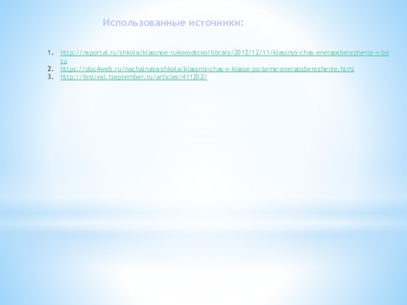 Использованные источники:http://nsportal.ru/shkola/klassnoe-rukovodstvo/library/2012/12/11/klassnyy-chas-energosberezhenie-v-bytuhttps://doc4web.ru/nachalnaya-shkola/klassniy-chas-v-klasse-po-teme-energosberezhenie.htmlhttp://festival.1september.ru/articles/411202/