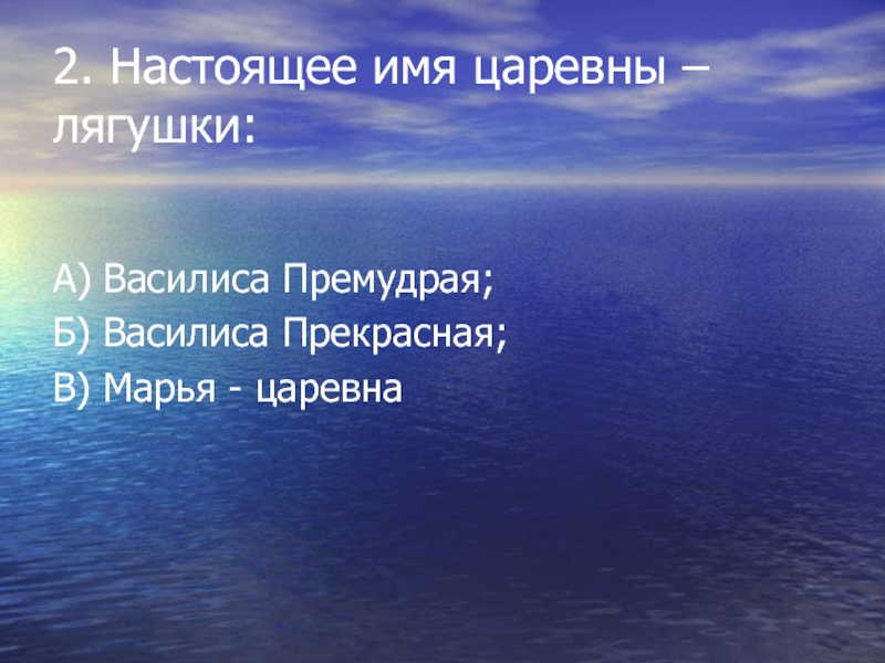 2. Настоящее имя царевны – лягушки:А) Василиса Премудрая; Б) Василиса Прекрасная;В) Марья - царевна