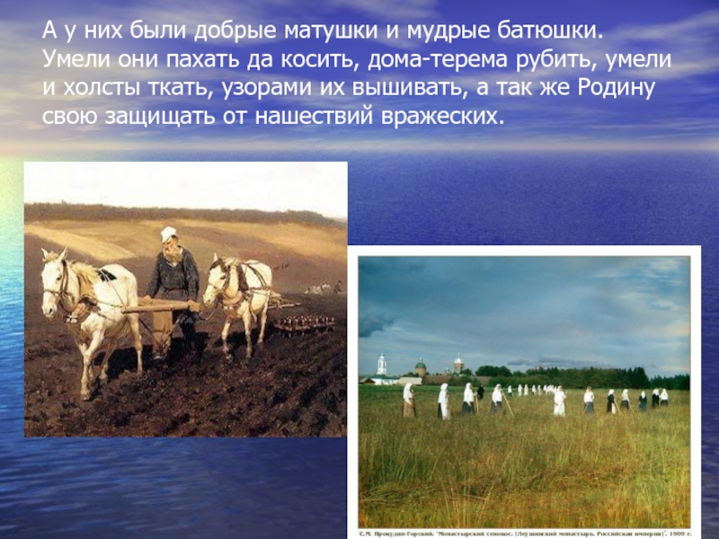 А у них были добрые матушки и мудрые батюшки. Умели они пахать да косить, дома-терема рубить, умели