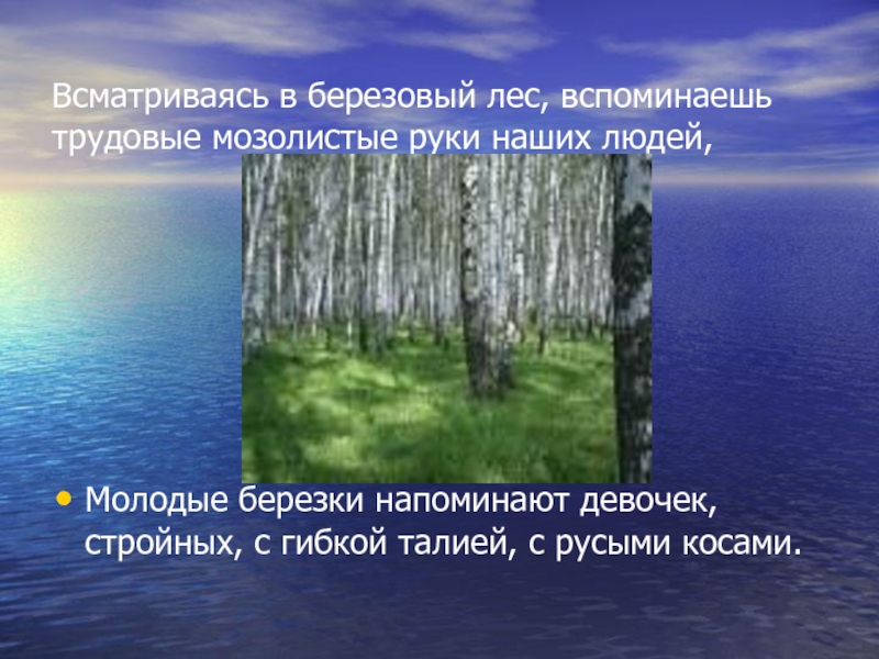 Слайд 8Всматриваясь в березовый лес, вспоминаешь трудовые мозолистые руки наших людей,