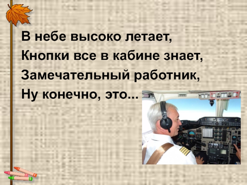 В небе высоко летает,Кнопки все в кабине знает,Замечательный работник,Ну конечно, это...