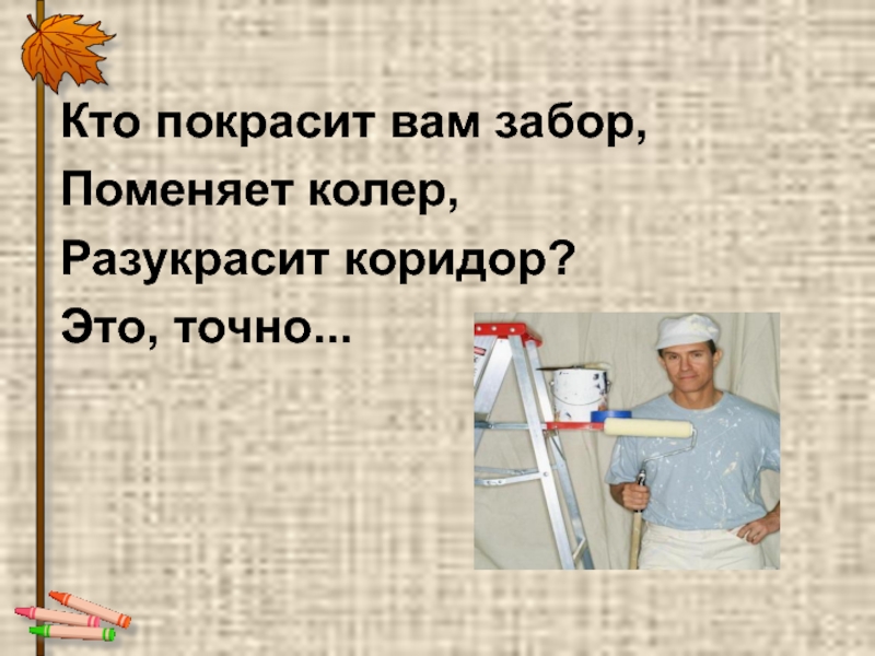 Кто покрасит вам забор,Поменяет колер,Разукрасит коридор?Это, точно...