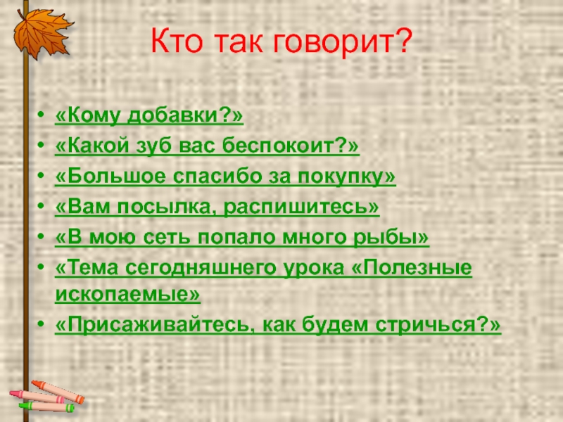 Кто так говорит?«Кому добавки?»«Какой зуб вас беспокоит?»«Большое спасибо за покупку» «Вам посылка, распишитесь»«В мою сеть попало много