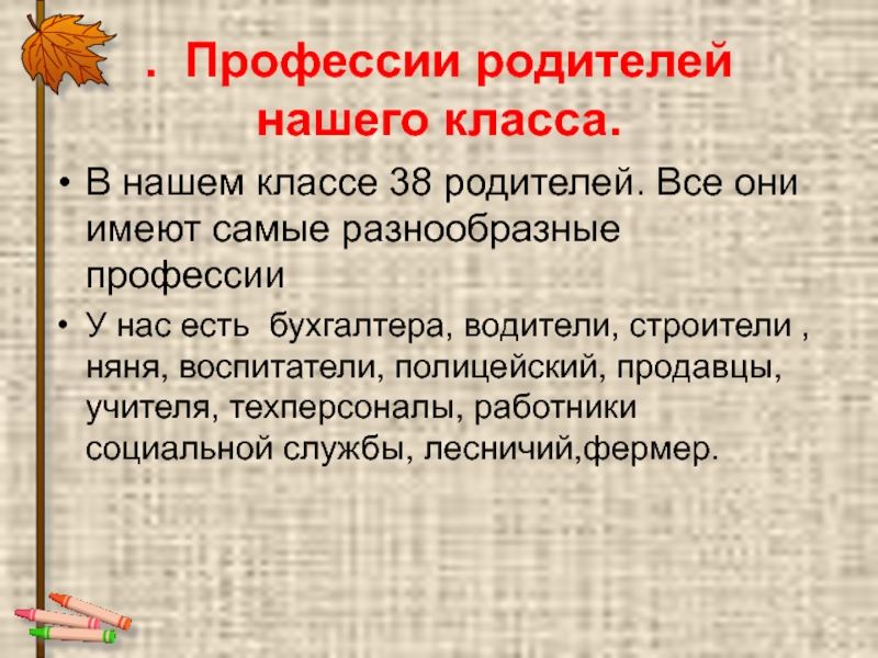 . Профессии родителей нашего класса. В нашем классе 38 родителей. Все они имеют самые разнообразные профессииУ нас