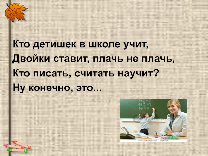 Кто детишек в школе учит,Двойки ставит, плачь не плачь,Кто писать, считать научит?Ну конечно, это...