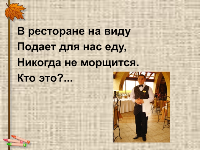 В ресторане на видуПодает для нас еду,Никогда не морщится.Кто это?...