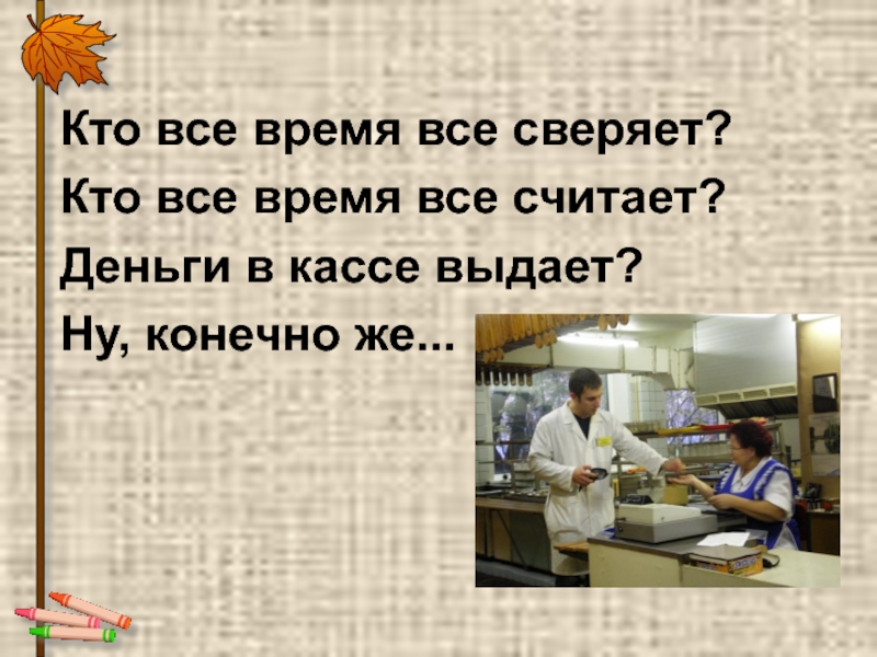 Кто все время все сверяет?Кто все время все считает?Деньги в кассе выдает?Ну, конечно же...