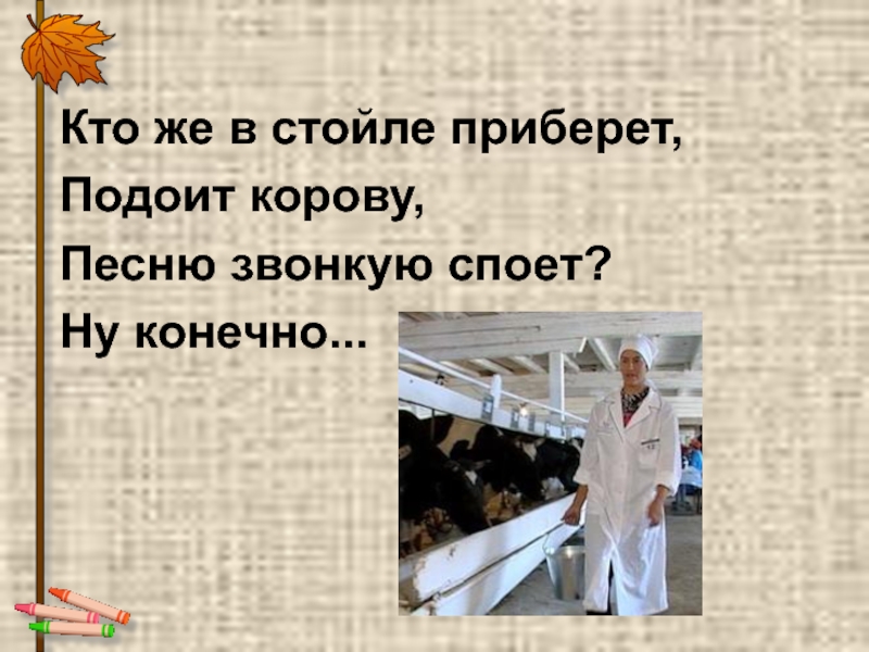 Кто же в стойле приберет,Подоит корову,Песню звонкую споет? Ну конечно...