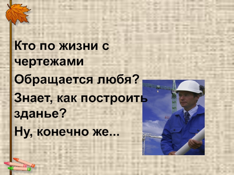 Кто по жизни с чертежамиОбращается любя?Знает, как построить зданье? Ну, конечно же...
