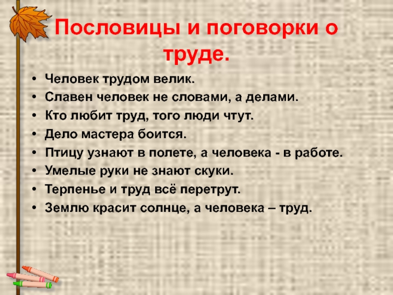 Пословицы и поговорки о труде. Человек трудом велик.Славен человек не словами, а делами.Кто любит труд, того люди