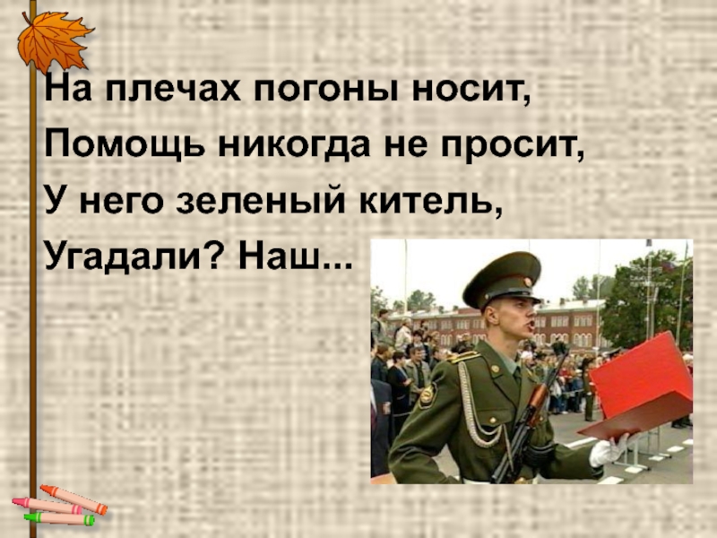 На плечах погоны носит,Помощь никогда не просит,У него зеленый китель,Угадали? Наш...
