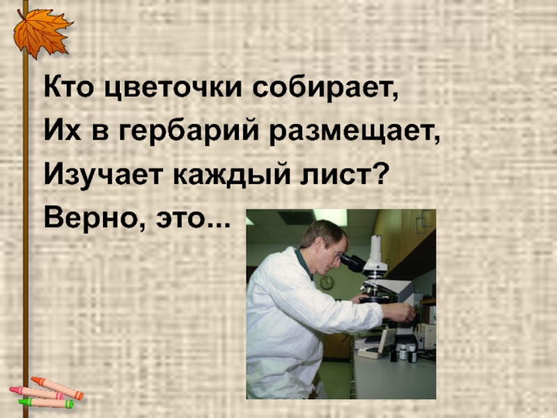 Кто цветочки собирает,Их в гербарий размещает,Изучает каждый лист?Верно, это...