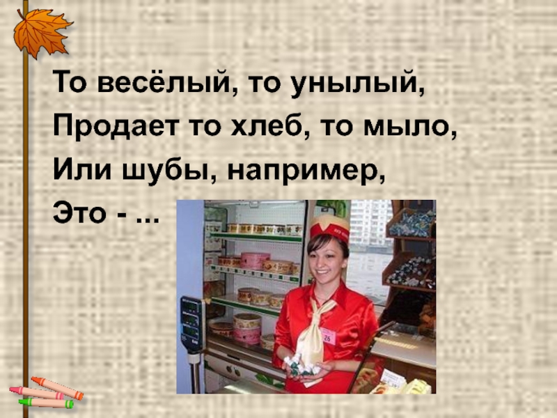 То весёлый, то унылый,Продает то хлеб, то мыло,Или шубы, например, Это - ...