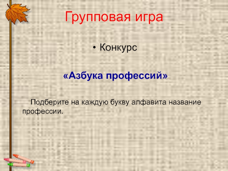 Групповая играКонкурс «Азбука профессий»    Подберите на каждую букву алфавита название профессии.