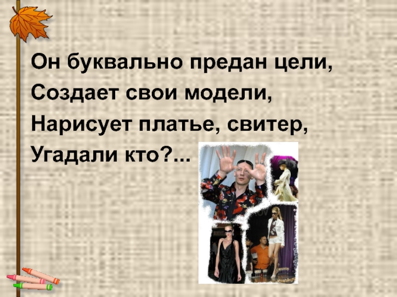 Он буквально предан цели, Создает свои модели, Нарисует платье, свитер, Угадали кто?...