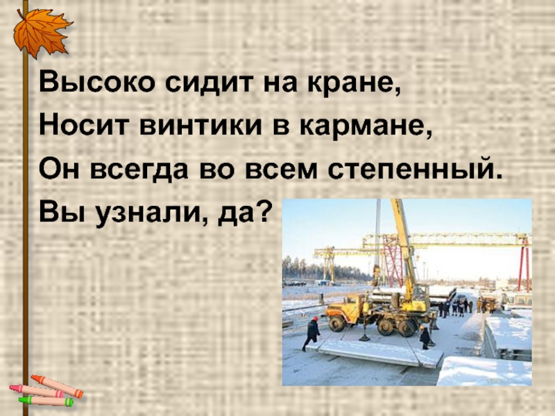 Высоко сидит на кране,Носит винтики в кармане,Он всегда во всем степенный.Вы узнали, да?