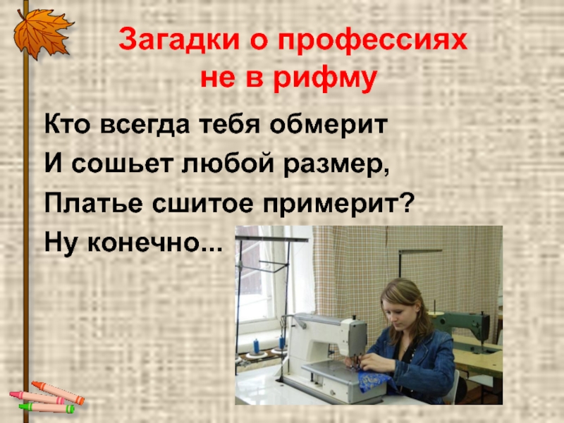 Загадки о профессиях  не в рифму Кто всегда тебя обмеритИ сошьет любой размер,Платье сшитое примерит?Ну