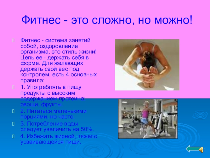 Фитнес - это сложно, но можно!Фитнес - система занятий собой, оздоровление организма, это стиль жизни! Цель ее