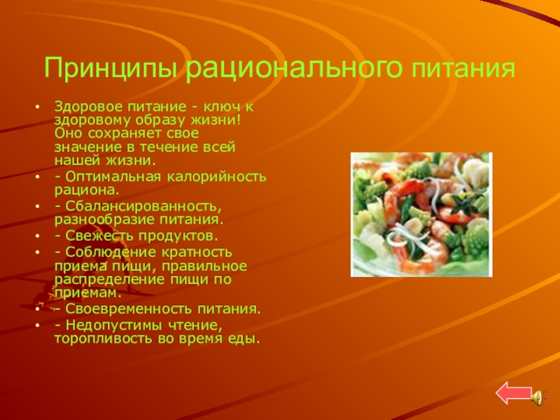 Принципы рационального питанияЗдоровое питание - ключ к здоровому образу жизни! Оно сохраняет свое значение в течение всей