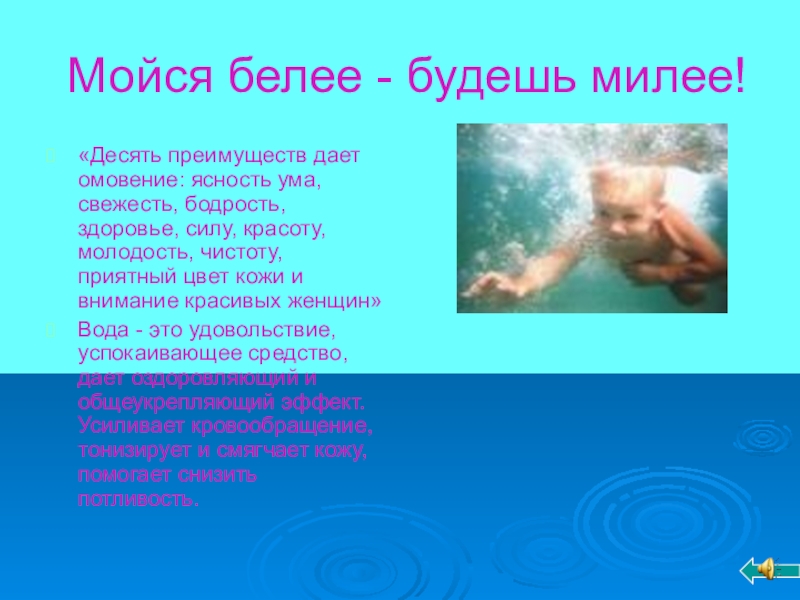 Мойся белее - будешь милее!«Десять преимуществ дает омовение: ясность ума, свежесть, бодрость, здоровье, силу, красоту, молодость, чистоту,