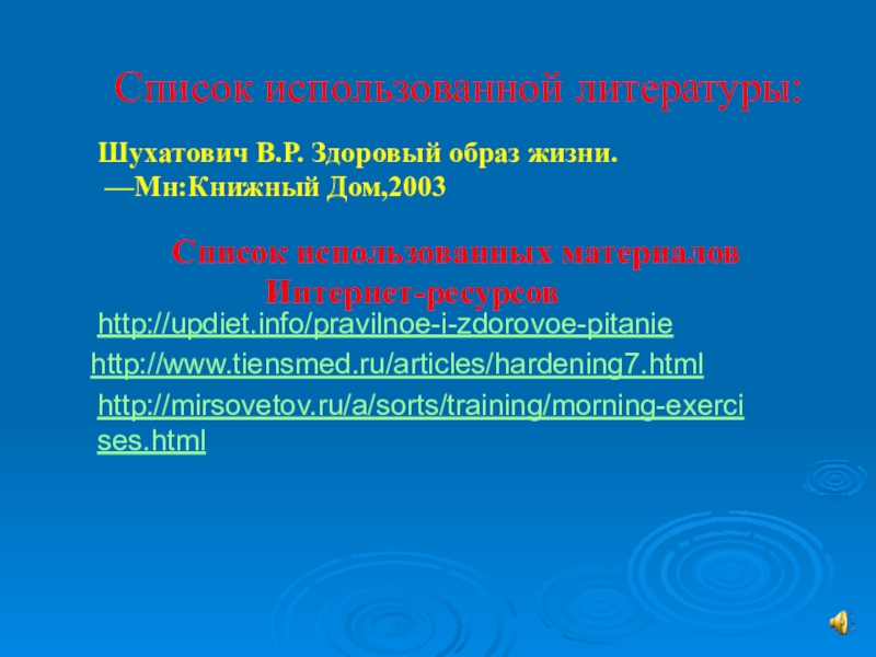 Список использованной литературы:http://www.tiensmed.ru/articles/hardening7.htmlhttp://updiet.info/pravilnoe-i-zdorovoe-pitaniehttp://mirsovetov.ru/a/sorts/training/morning-exercises.htmlШухатович В.Р. Здоровый образ жизни. —Мн:Книжный Дом,2003      Список