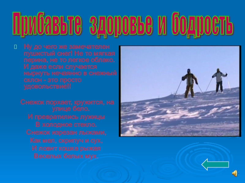 Прибавьте  здоровье и бодрость Ну до чего же замечателен пушистый снег! Не то мягкая перина, не