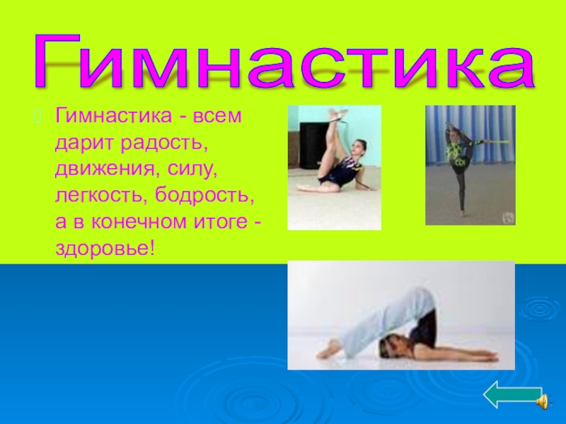 Гимнастика Гимнастика - всем дарит радость, движения, силу, легкость, бодрость, а в конечном итоге - здоровье!