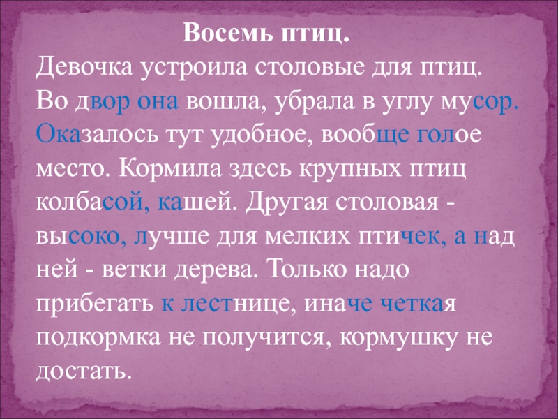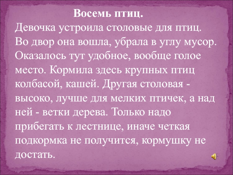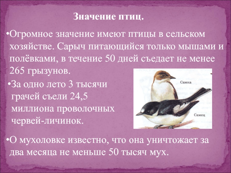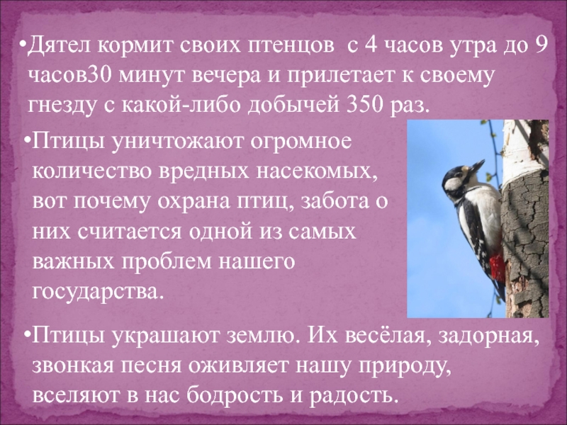 Птицы уничтожают огромное количество вредных насекомых, вот почему охрана птиц, забота о них считается одной из самых важных проблем нашего государства.