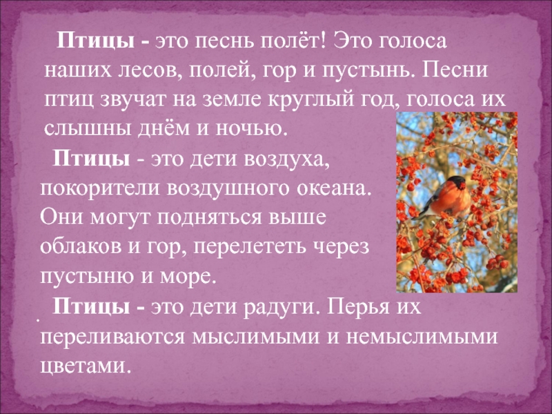 Птицы - это дети воздуха, покорители воздушного океана. Они могут подняться выше облаков и гор, перелететь через пустыню и море.