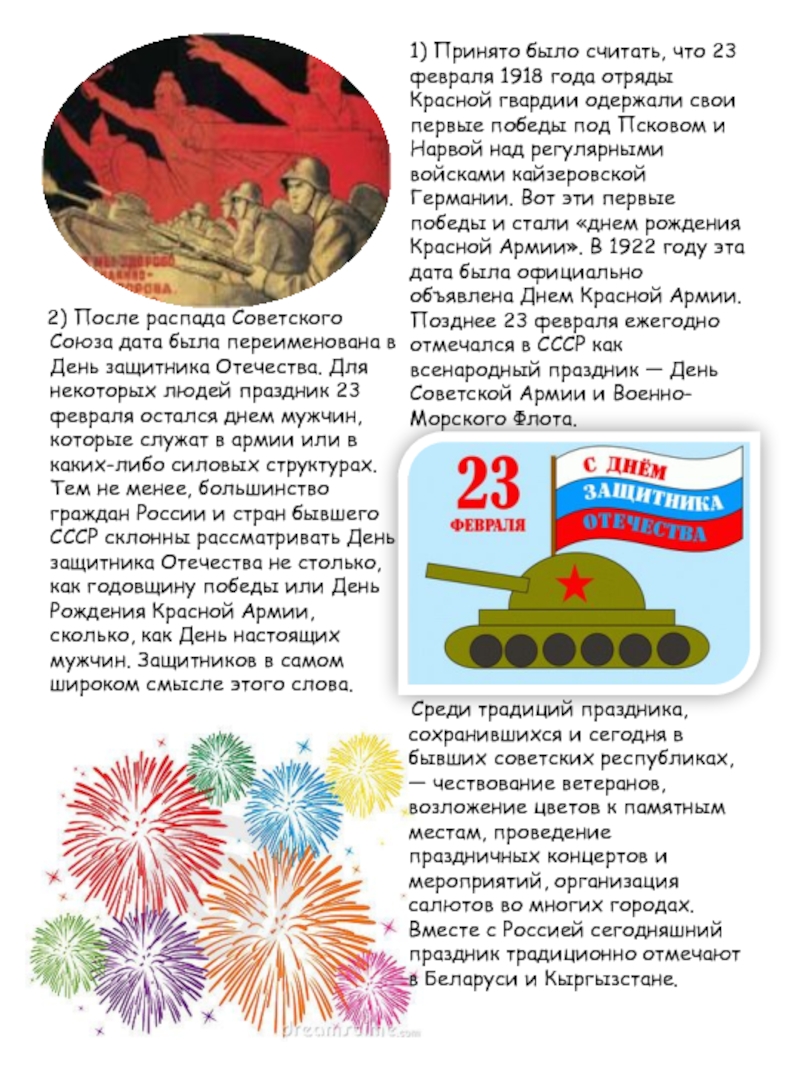 2) После распада Советского Союза дата была переименована в День защитника Отечества. Для некоторых людей праздник 23 февраля остался днем мужчин, которые служат в армии или в каких-либо силовых структурах. Тем не менее, большинство граждан России и стран бывшего СССР склонны рассматривать День защитника Отечества не столько, как годовщину победы или День Рождения Красной Армии, сколько, как День настоящих мужчин. Защитников в самом широком смысле этого слова.