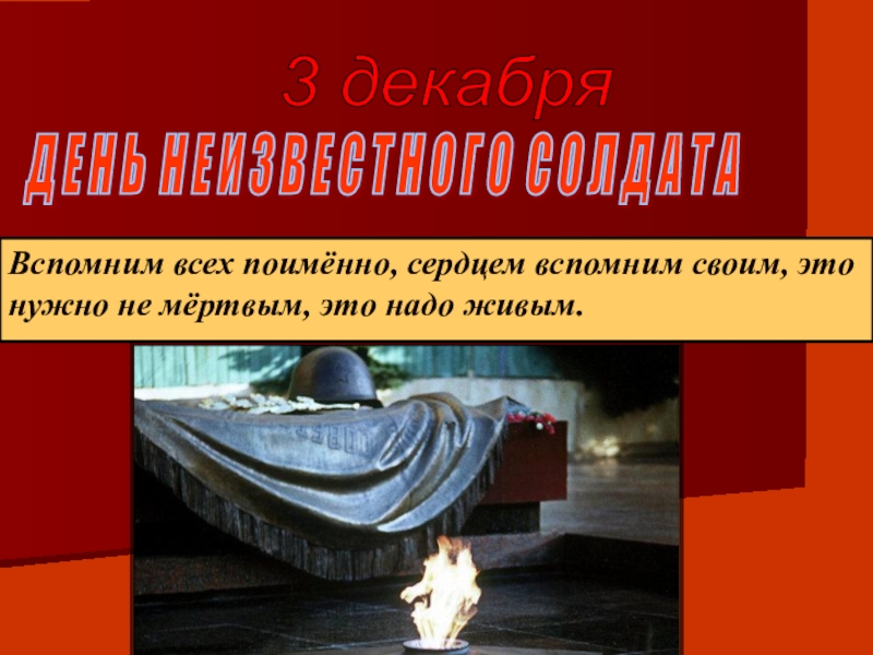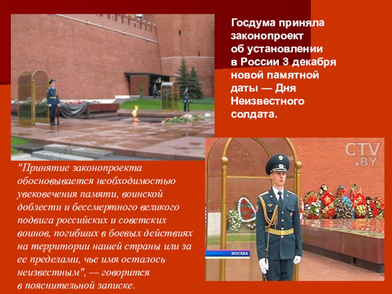 Госдума приняла законопроект об установлении в России 3 декабря новой памятной даты — Дня Неизвестного солдата.