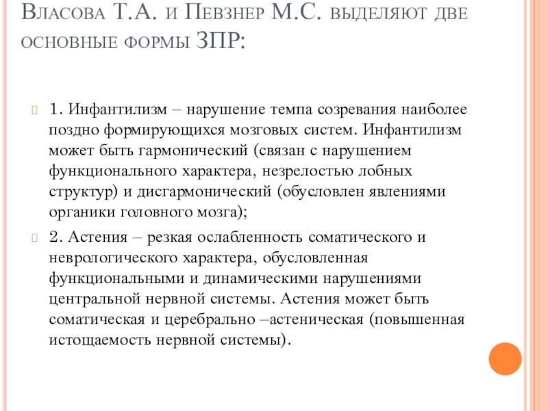 Слайд 6Власова Т.А. и Певзнер М.С. выделяют две основные формы ЗПР: