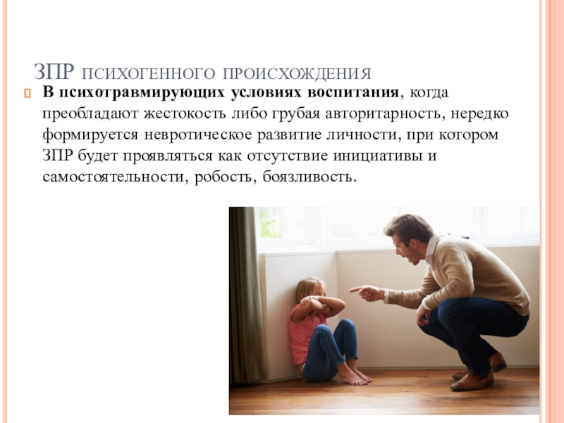 грубая авторитарность, нередко формируется невротическое развитие личности, при котором ЗПР будет проявляться как отсутствие инициативы и самостоятельности, робость, боязливость.