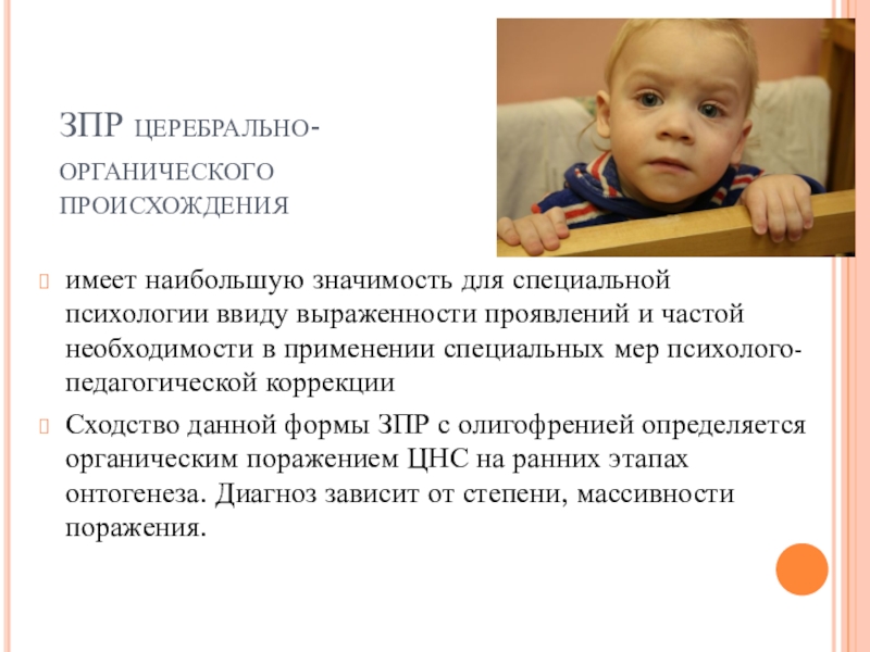 Сходство данной формы ЗПР с олигофренией определяется органическим поражением ЦНС на ранних этапах онтогенеза. Диагноз зависит от степени, массивности поражения.