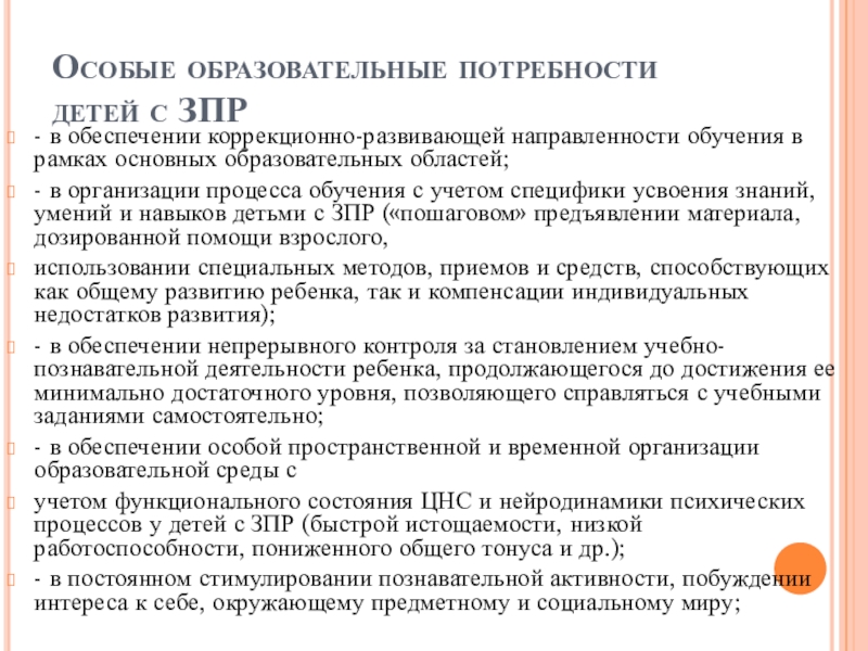 Слайд 19Особые образовательные потребности детей с ЗПР