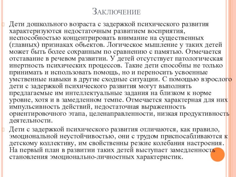 неспособностью концентрировать внимание на существенных (главных) признаках объектов. Логическое мышление у таких детей может быть более сохранным по сравнению с памятью. Отмечается отставание в речевом развитии. У детей отсутствует патологическая инертность психических процессов. Такие дети способны не только принимать и использовать помощь, но и переносить усвоенные умственные навыки в другие сходные ситуации. С помощью взрослого дети с задержкой психического развития могут выполнять предлагаемые им интеллектуальные задания на близком к норме уровне, хотя и в замедленном темпе. Отмечается характерная для них импульсивность действий, недостаточная выраженность ориентировочного этапа, целенаправленности, низкая продуктивность деятельности.