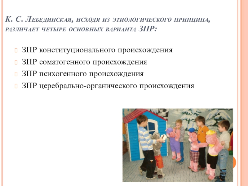 Слайд 7К. С. Лебединская, исходя из этиологического принципа, различает четыре основных варианта