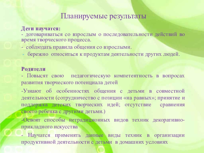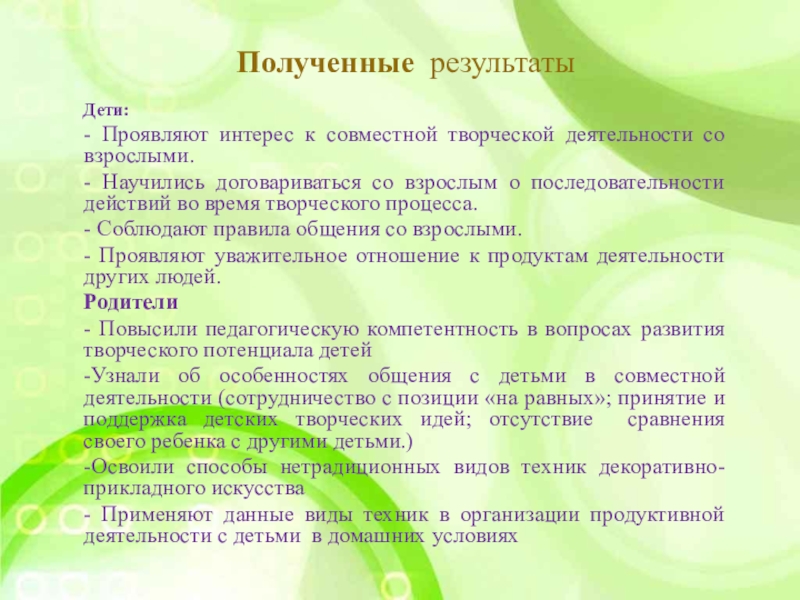 -Узнают об особенностях общения с детьми в совместной деятельности (сотрудничество с позиции «на равных»; принятие и поддержка детских творческих идей; отсутствие сравнения своего ребенка с другими детьми.)
