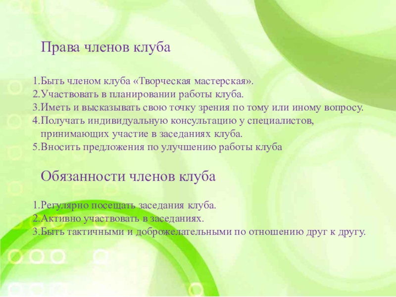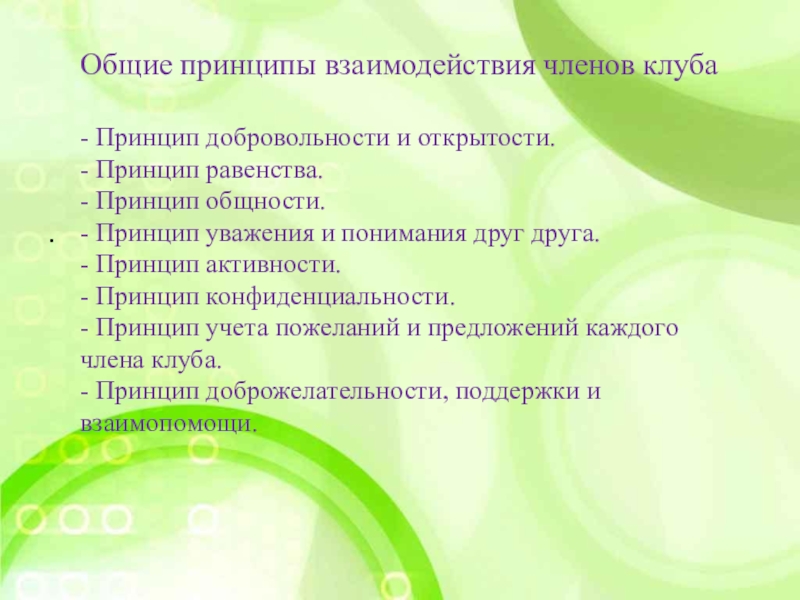 - Принцип учета пожеланий и предложений каждого члена клуба.