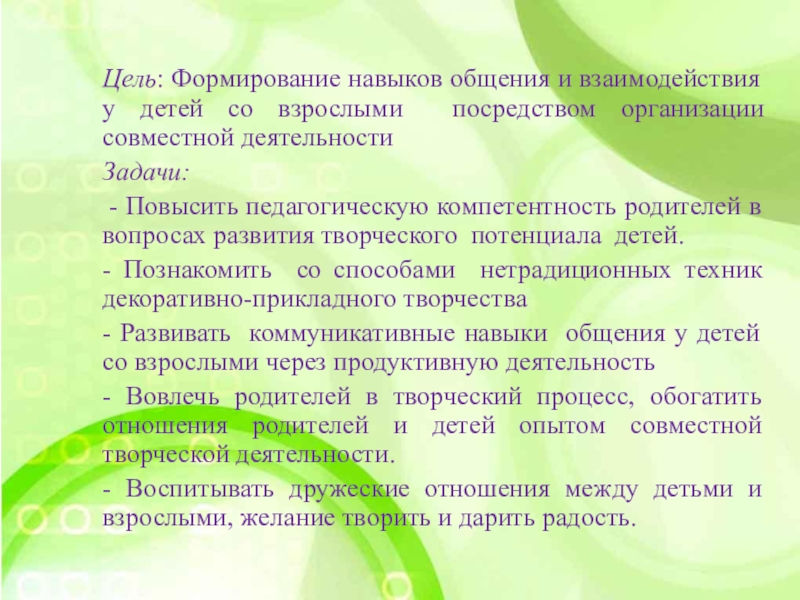 - Вовлечь родителей в творческий процесс, обогатить отношения родителей и детей опытом совместной творческой деятельности.