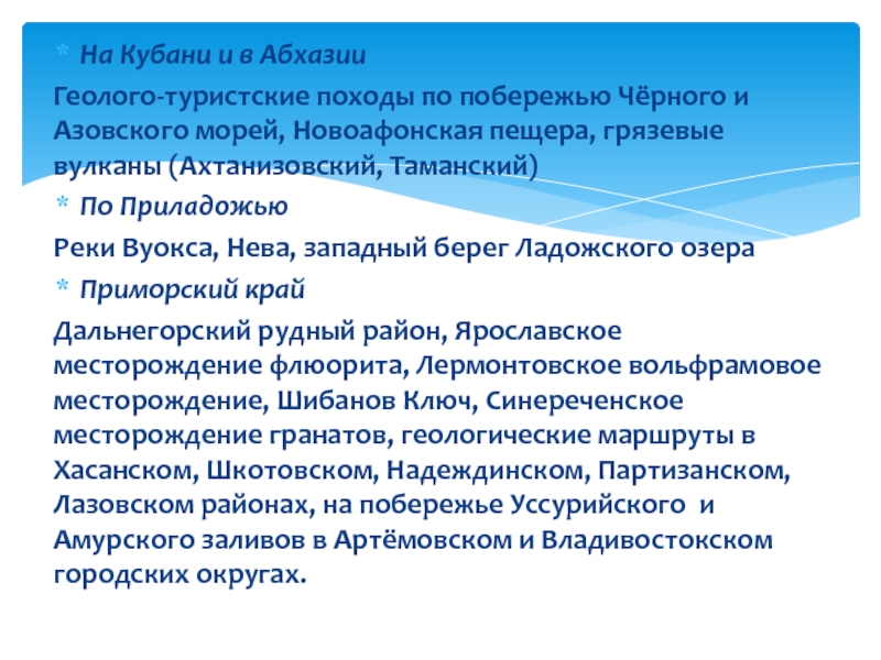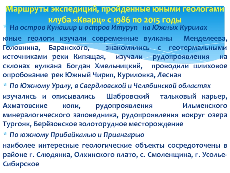 юные геологи изучали современные вулканы Менделеева, Головнина, Баранского, знакомились с геотермальными источниками реки Кипящая, изучали рудопроявления на склонах вулкана Богдан Хмельницкий, проводили шлиховое опробование рек Южный Чирип, Куриловка, Лесная