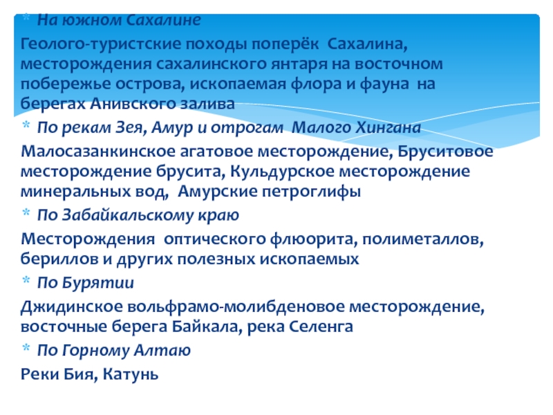 наиболее интересные геологические объекты сосредоточены в районе г. Слюдянка, Олхинского плато, с. Смоленщина, г. Усолье-Сибирское
