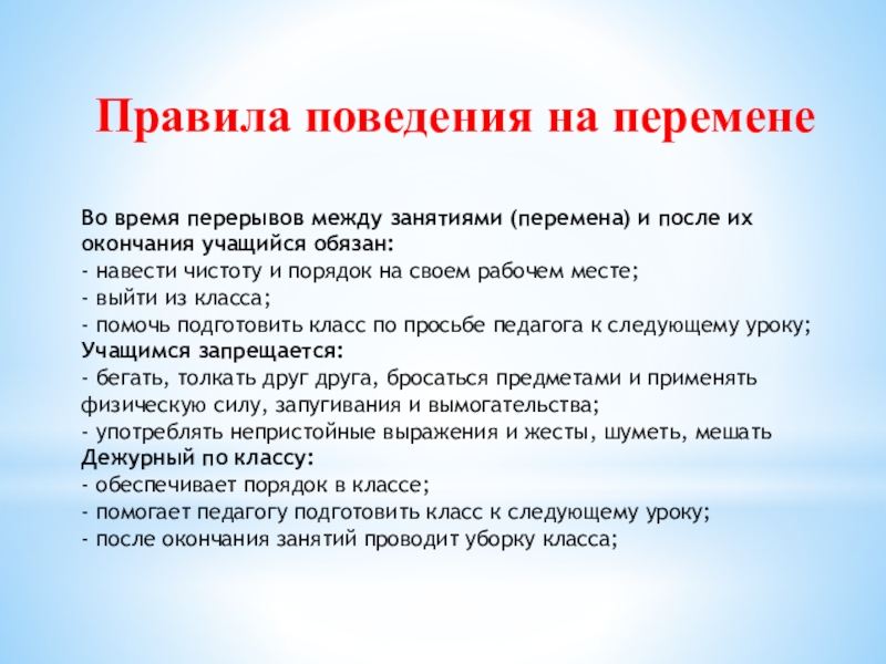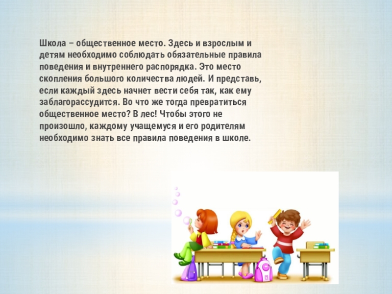 обязательные правила поведения и внутреннего распорядка. Это место скопления большого количества людей. И представь, если каждый здесь начнет вести себя так, как ему заблагорассудится. Во что же тогда превратиться общественное место? В лес! Чтобы этого не произошло, каждому учащемуся и его родителям необходимо знать все правила поведения в школе.