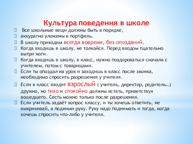 Если ты опоздал на урок и заходишь в класс после звонка, необходимо спросить разрешения у учителя.
