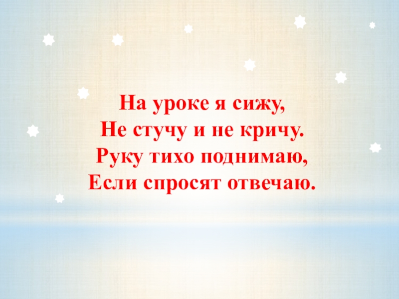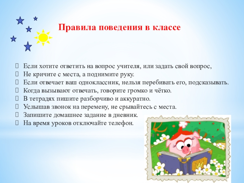 Если учитель задаёт вопрос классу, и ты хочешь ответить, не выкрикивай, а подними руку. Руку надо поднимать и тогда, когда хочешь спросить что-либо у учителя.