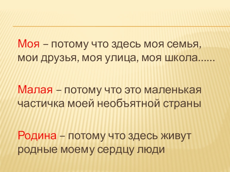 Моя – потому что здесь моя семья, мои друзья, моя улица, моя школа……Малая – потому что это маленькая частичка моей необъятной страныРодина – потому что здесь живут родные моему сердцу люди