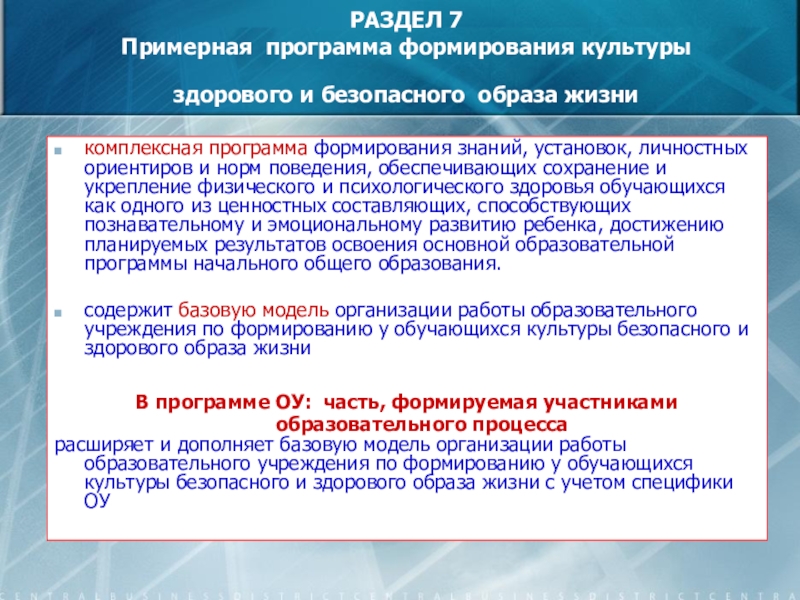 содержит базовую модель организации работы образовательного учреждения по формированию у обучающихся культуры безопасного и здорового образа жизни