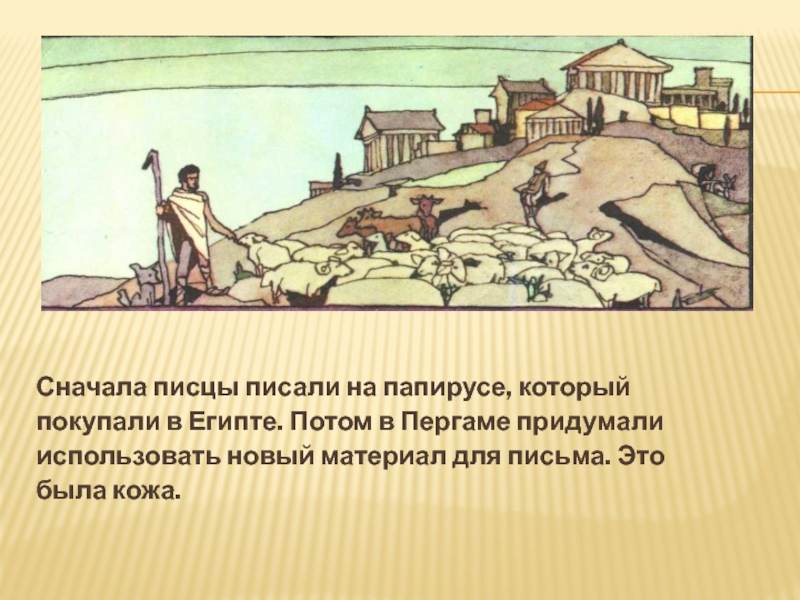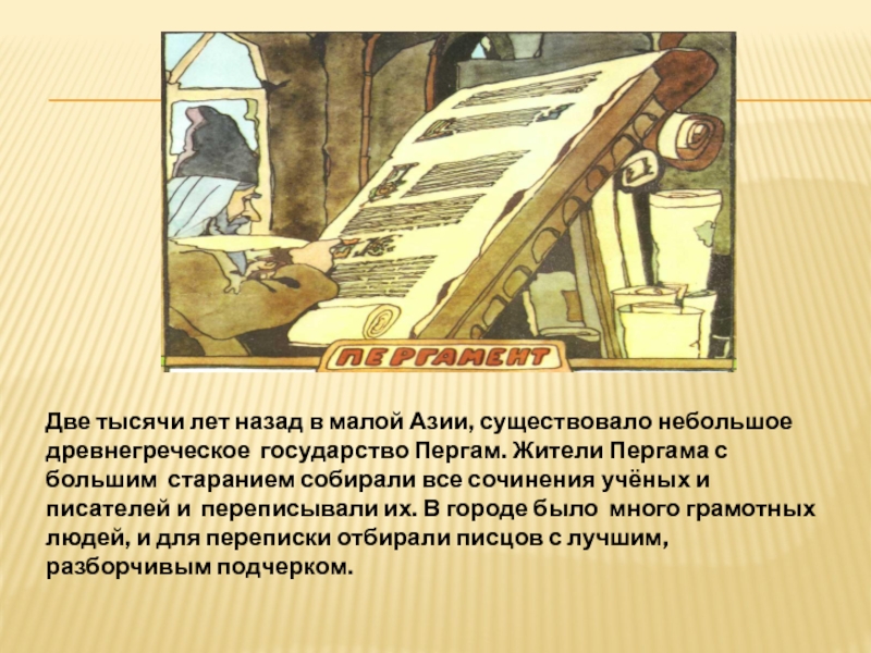 Пергам. Жители Пергама с большим старанием собирали все сочинения учёных и писателей и переписывали их. В городе было много грамотных людей, и для переписки отбирали писцов с лучшим, разборчивым подчерком.