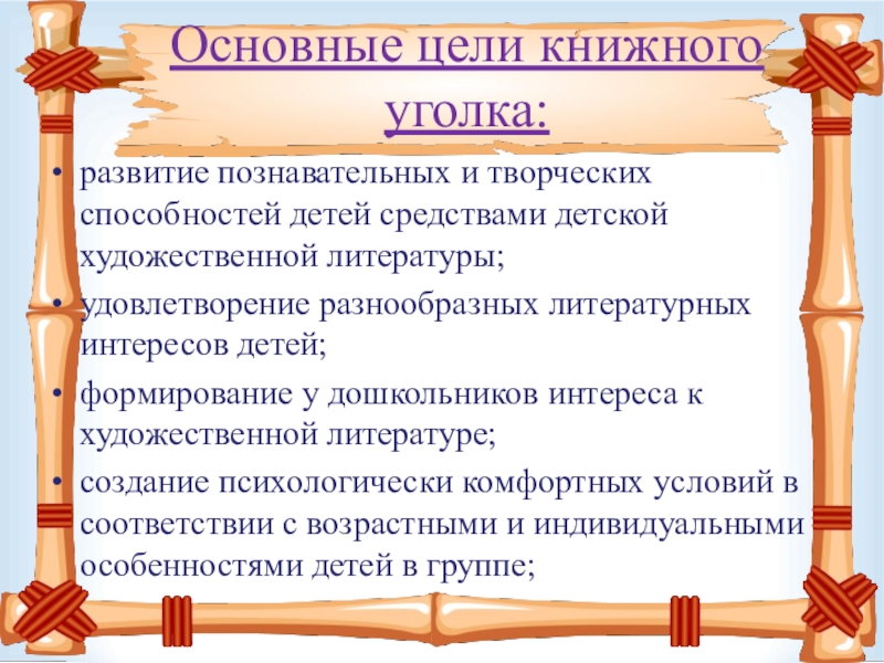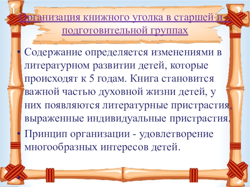 Слайд 4Организация книжного уголка в старшей и – подготовительной группах